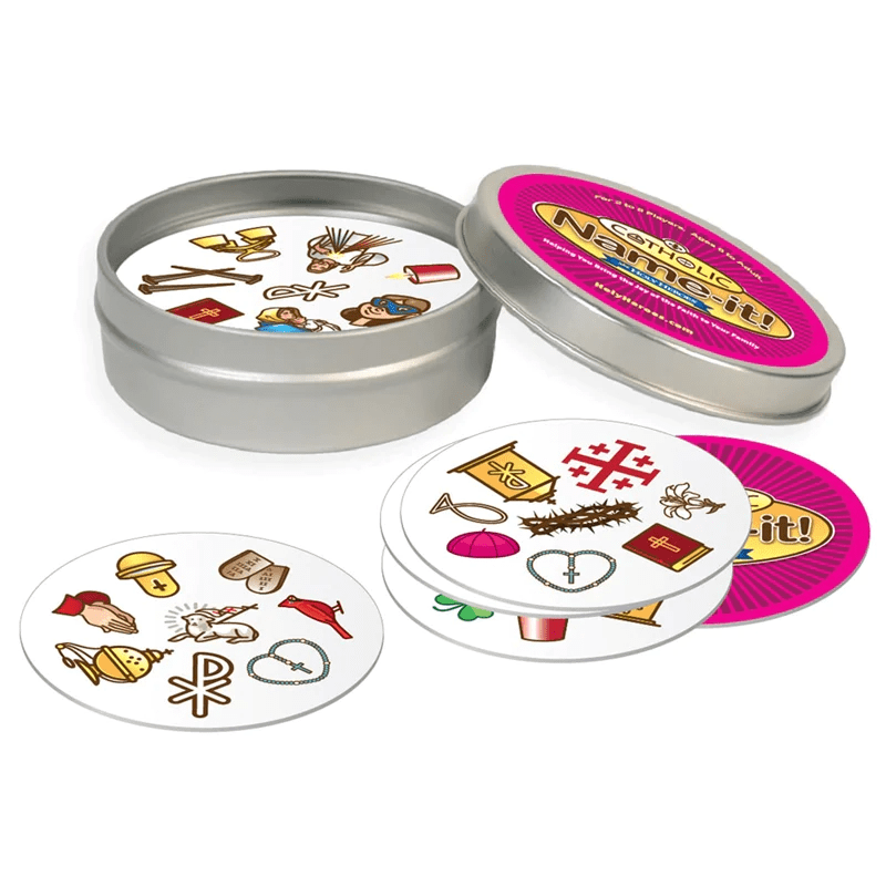Can your children recognize all 57 objects in our Catholic Name - It! game? 57 cards...57 Catholic objects and symbols...8 objects on each card...But only 1 object matches between any 2 cards … Wow! To WIN: you match it … NAME-IT! … and claim it! Fast-paced Family Fun!