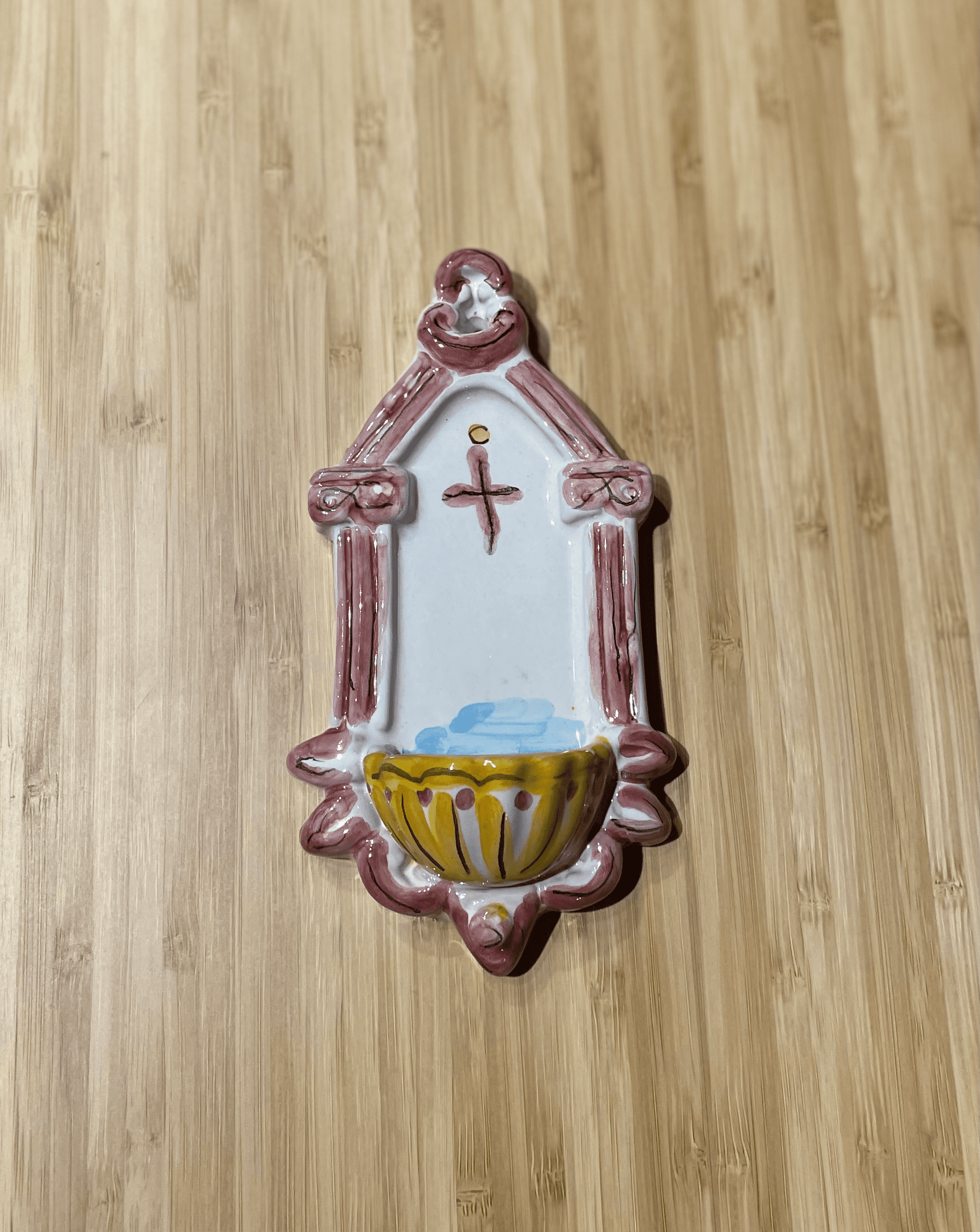Hand painted holy water stoup made in Monreale, Sicily. A wonderful reminder of our baptism and of the holiness of the house of every Christian. Ideal for entrance porches or by a bedroom door.