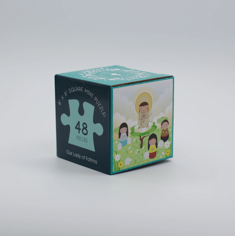 The Virgin of Fatima appeared in Portugal in 1917.Three little shepherd children were chosen by God to see visions of the beautiful Virgin Mary. These visions culminated in the awe inspiring Miracle of the Sun, which gave hope and reignited faith for thousands of people! Puzzles are excellent development tools that teach concentration, hand-eye coordination, memory, and shape recognition- and they’re fun! Our adorable “mini” puzzles are a fun, beautiful and affordable way to work on developmental skills while learning about the faith. Each finished puzzle is 8″ x 8″ square, and comes packed in an adorable cube box- perfect for gifting and storage too! Warning: Choking hazard. Not for children under 3 years old. Puzzle boards are made using 100% recycled materials, and vibrant non-toxic inks.